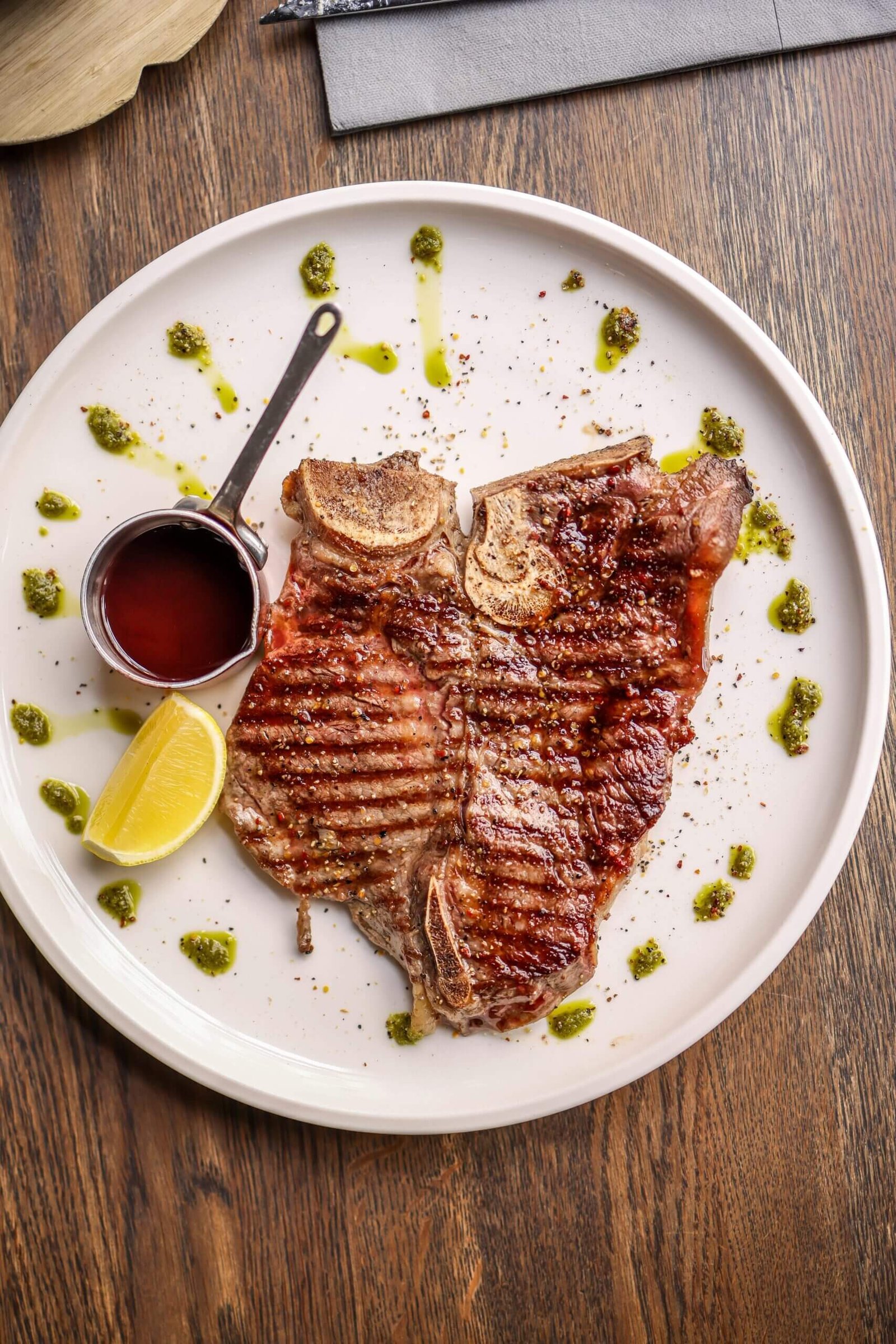 Premium T-bone steak grilled over open flame.